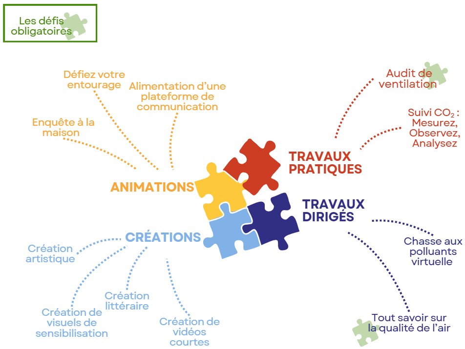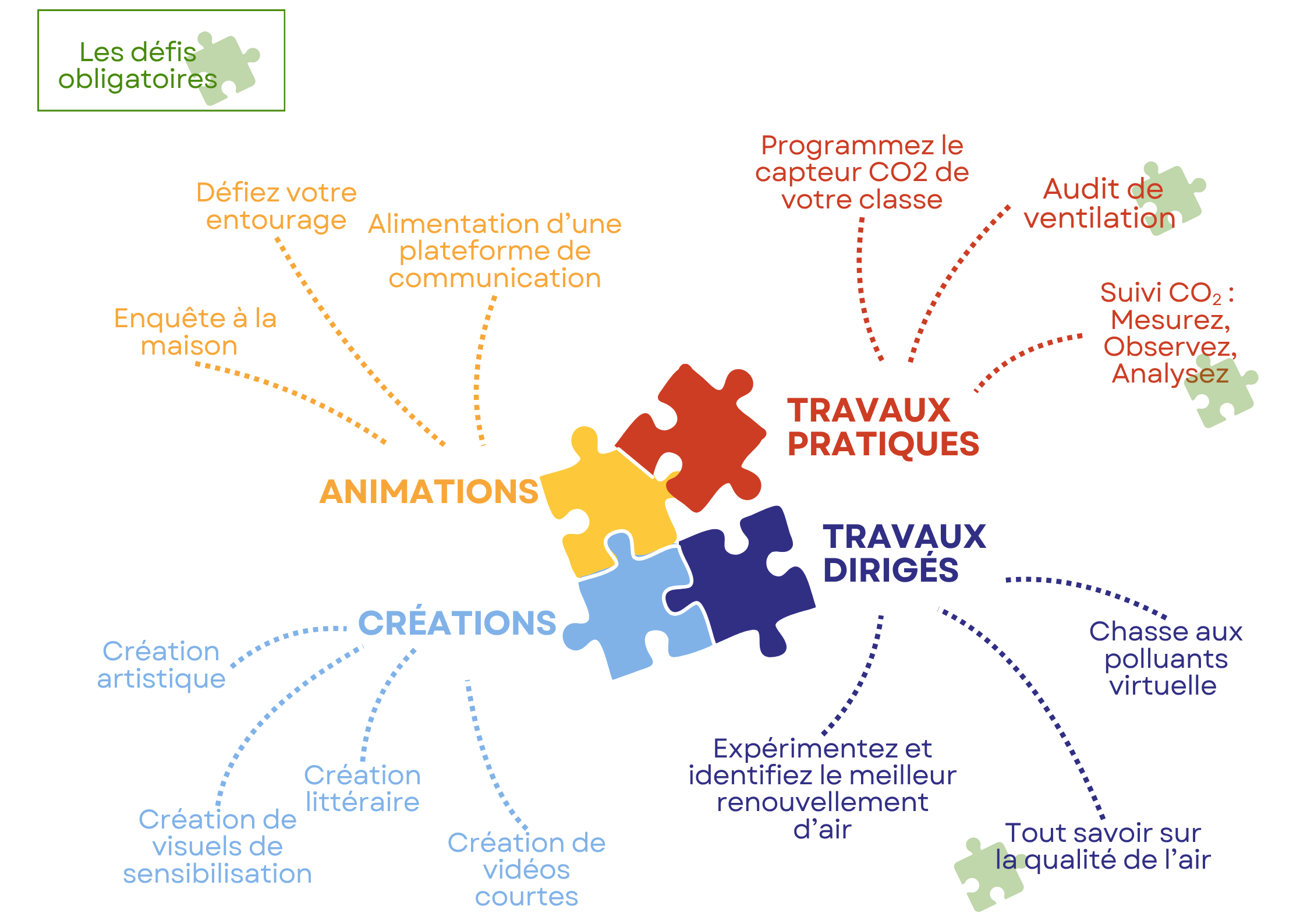 Ces défis obligatoires nous permettent d’avoir une base commune pour évaluer à la fois les classes participantes, mais également pour nous permettre une évaluation globale du projet. Ils ont été choisis sur la base de leur apport en termes de connaissances sur la QAI et ses solutions.